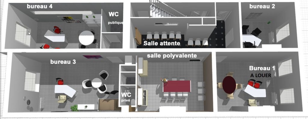 L’immeuble est composé de 4 cabinets, d’une salle de réunion, d’une salle d’attente et de 2 toilettes.